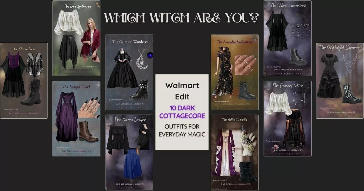A curated lookbook of complete witchy outfits — all from Walmart, all under $90, and most under $60.