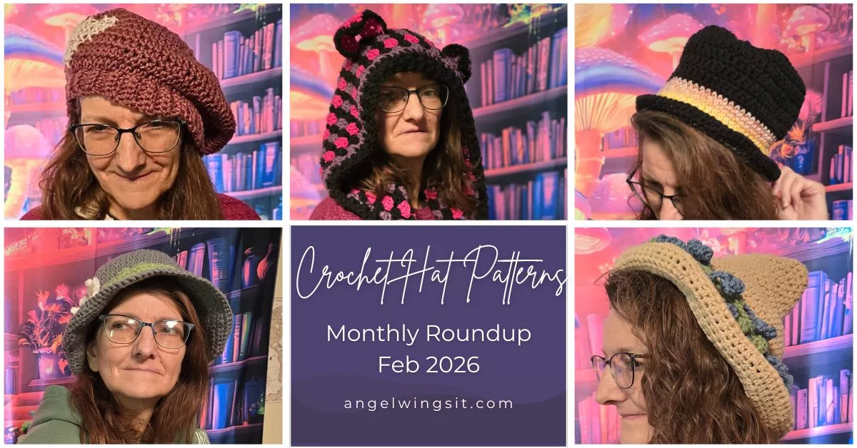 Crochet hat patterns were the theme of my month, and February turned into a cozy little parade of color, texture, and intuition. I made a mix of crochet hats, loom‑knit pieces, and whimsical hoods, and each one taught me something new about silhouette, fit, and how different shapes work with my triangle‑shaped face. Below you’ll find my notes, photos, and the full list of crochet hat patterns I used, along with links to each designer’s original page.