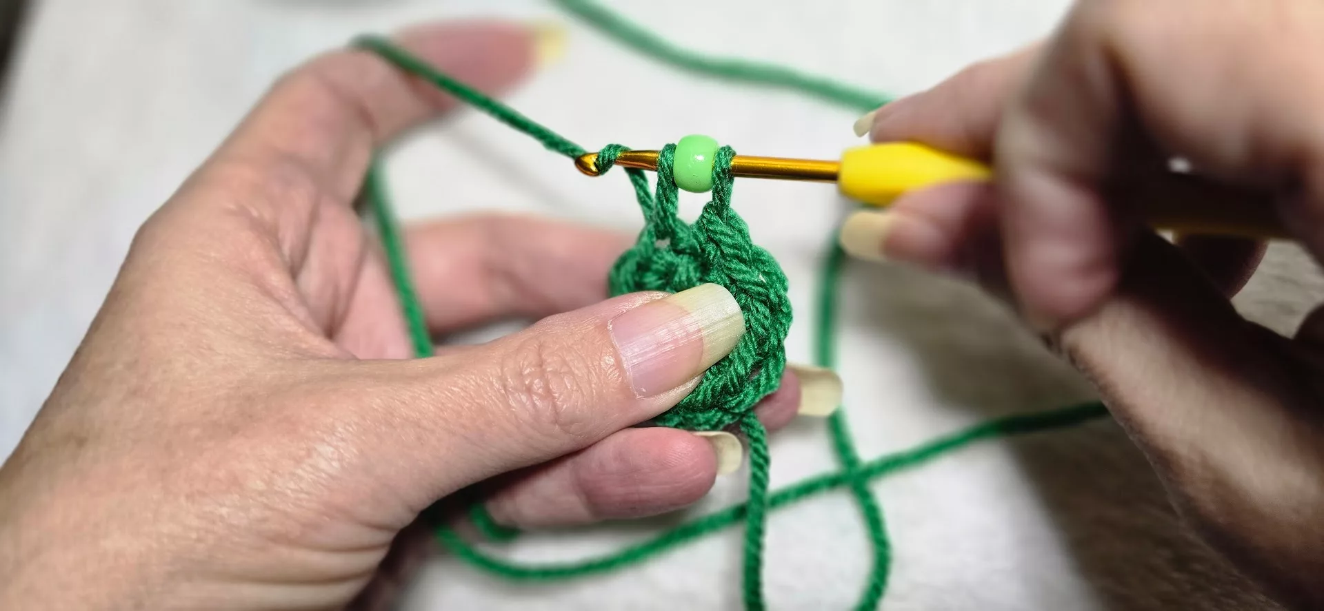 - Yarn over again and pull through all three (both regular loops and the bead).
