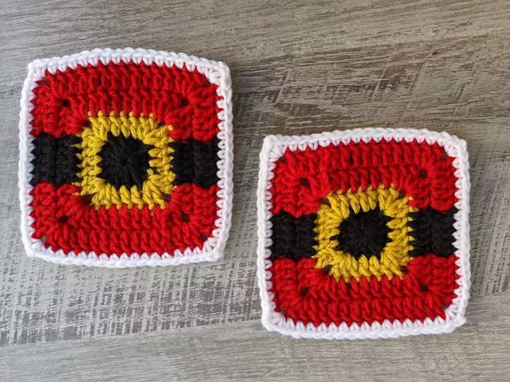 Santa’s iconic belt is the star of this square. Rich reds, black, and yellow yarn form a fun, graphic design that’s great for incorporating into blankets or playful Christmas accessories.