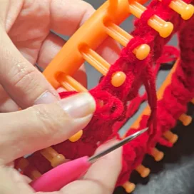 If you’ve never purled on a loom before, this is a gentle place to learn. A loom purl is just a small scoop‑and‑trade motion. Bring your working yarn in front of the peg, then use your hook to scoop the working yarn up from underneath the loop on the peg. Lift the old loop off, and place the new loop you just made onto the peg. It feels a little like swapping loops — slow and steady is all you need.