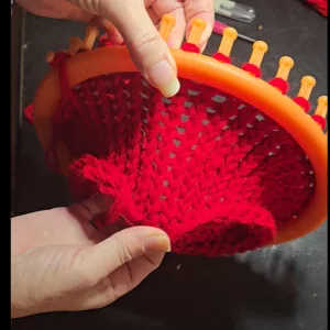 E‑wrap each round the same way you did during the cast‑on: wrap each peg once, then knit off. The doubled strands make the fabric feel plush and warm as it grows downward through the center of the loom.