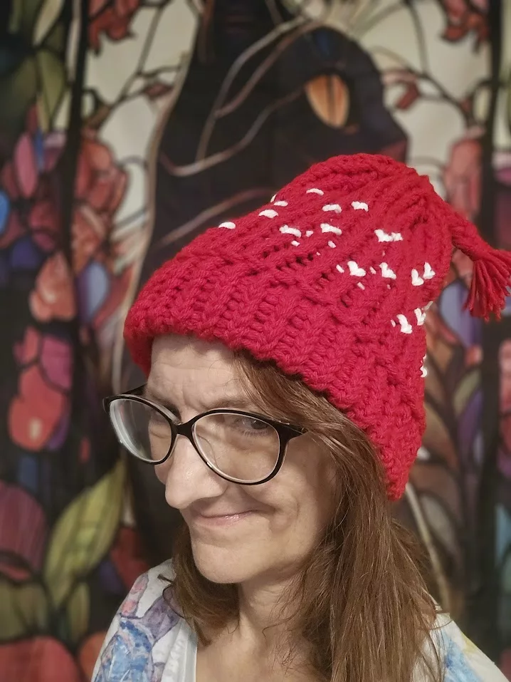 You can knit the hat exactly as shown in bold red, or make it in any solid color you love — the design is flexible, approachable, and easy to personalize. The heart‑pattern technique was adapted from Late Loomer’s Fair Isle Beanie tutorial, which helped shape the rhythm of the colorwork in this version.